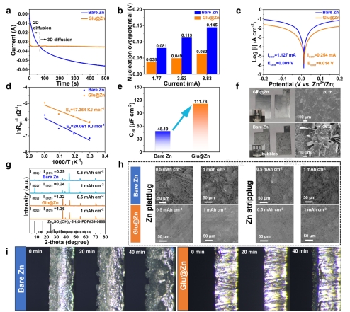据悉,该研究采用简单的谷氨酸刻蚀法,选择性蚀刻晶面,一方面,降低了表面能,成功制备了以(002)晶面为主的新型锌负极;另一方面,谷氨酸蚀刻剂中的负电性羰基氧原子与金属锌表面发生反应,形成了界面保护层,可有效修饰Glu@Zn负极表面晶界。基于此,在0.5mA cm-2下,Glu@Zn负极对称电池可稳定运行4400h以上,平均库仑效率高达98.9%;即使在50%的深度放电条件下也能稳定循环超过250小时。此外,与NH4V4O10正极匹配的全电池在0.5 A g-1的低电流密度下,经400个循环后,比容量仍能保持291.6 mAh g-1。鉴于该方法的简单有效性,将有力促进ZMBs锌金属负极的应用研究。