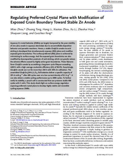 近日,学校先进碳基功能材料湖南省重点实验室侯朝辉教授、51fun吃瓜入口周苗博士在开发高性能水系锌离子电池关键负极材料中取得新进展,研究成果以“Regulating Preferred Crystal Plane with Modification of Exposed Grain Boundary Toward Stable Zn Anode”为题发表于Advanced Functional Materials杂志(IF18.5,SCI一区TOP期刊,材料科学类JCR排名第一)。我校为该论文的第一完成单位,周苗博士为第一作者和通讯作者,侯朝辉教授和中南大学方国赵教授为共同通讯作者。