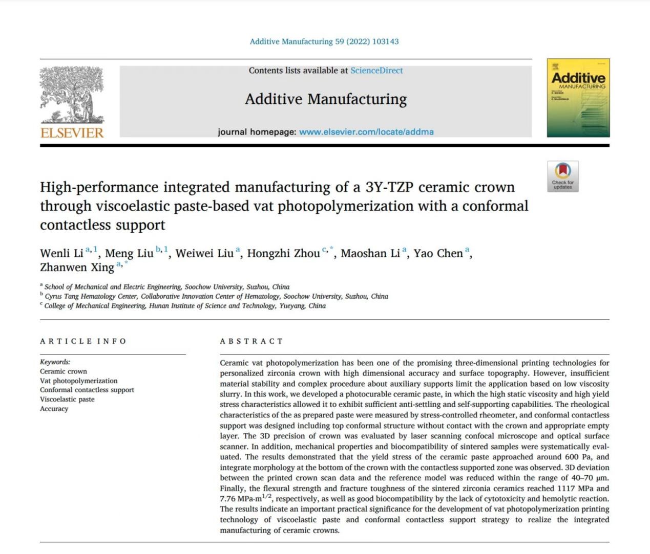 近日,我院周宏志教授在全瓷冠3D打印技术及评价方面取得新进展。研究成果以“High-performance integrated manufacturing of a 3Y-TZP ceramic crown through viscoelastic paste-based vat photopolymerization with conformal contactless support”为题发表于Additive Manufacturing杂志 (IF 11.632,SCI一区,制造工程类JCR排名第一)。