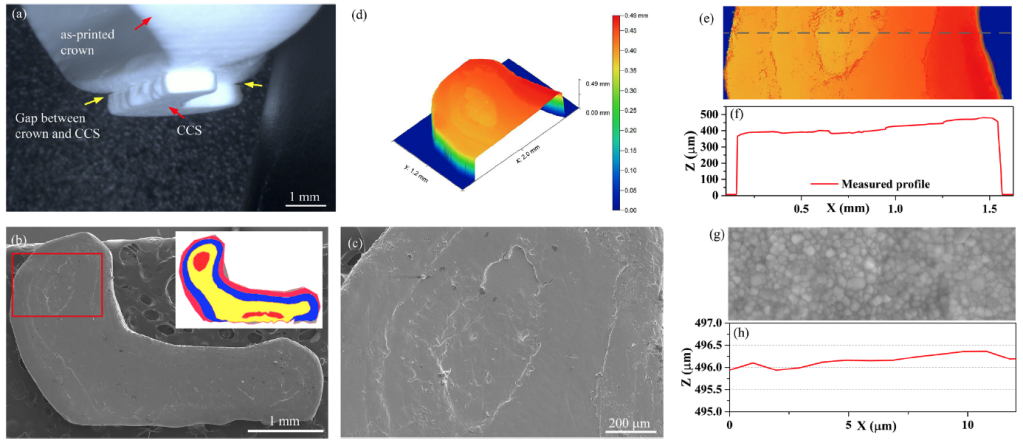 据悉,该项研究在构建得到具有良好打印适性和高固含氧化锆粘弹膏体的基础上,利用自主研制的陶瓷立体光刻3D打印设备,成功实施了基于剪切形变控制的复杂曲面随形非接触支撑策略,开展了牙科全瓷修复体的形性一体化制造与三维精度及生物医学评价研究。相关工作得到了复杂结构拓扑创新设计与制造湖南省工程研究中心的支持。