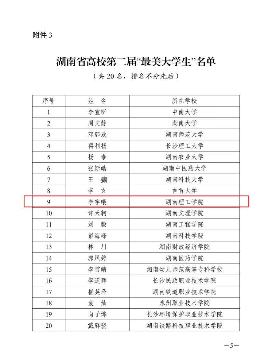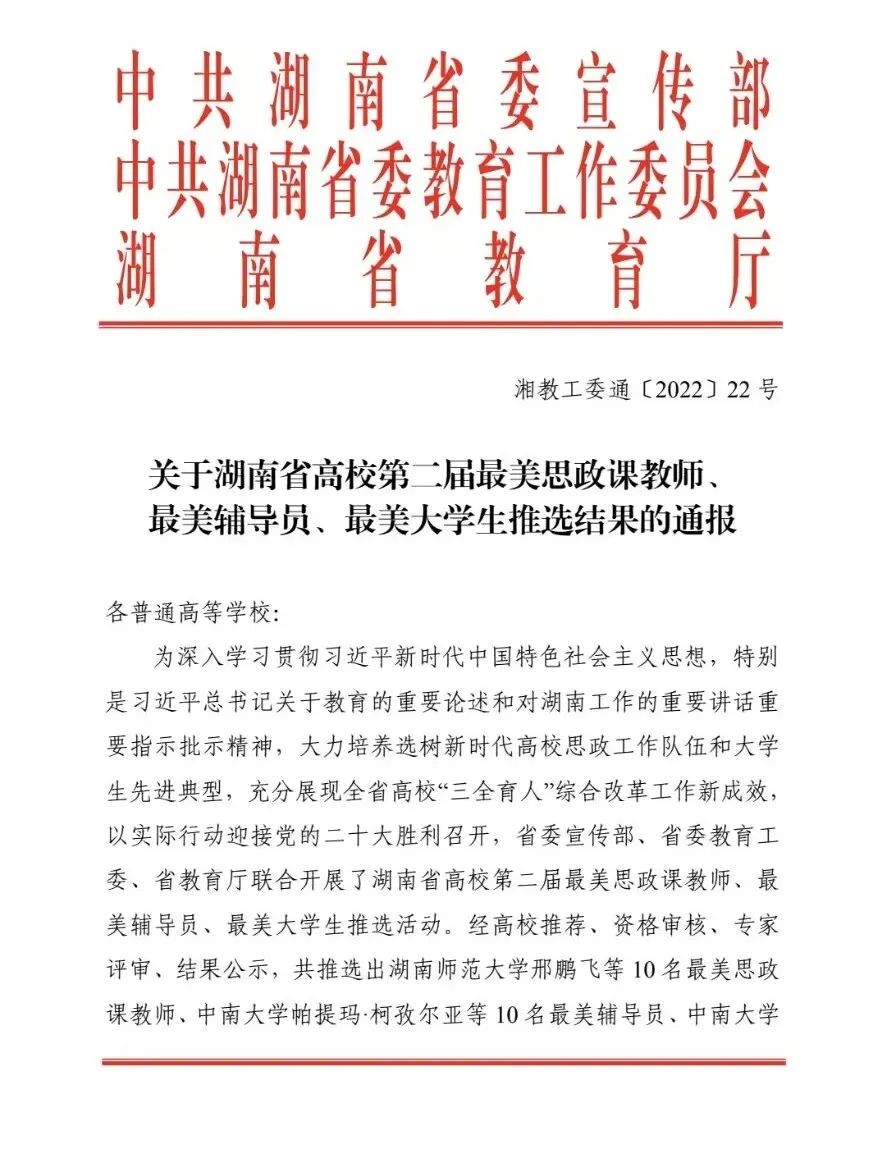 10月8日,“关于湖南省高校第二届最美思政课教师、最美辅导员、最美大学生推选结果的通报”公布,我院19级机自三班李宇曦同学获湖南省“最美大学生”称号,为我校获得此项荣誉的第一人。 (责编/王荣荣 初审/徐湛 终审/胡文静)