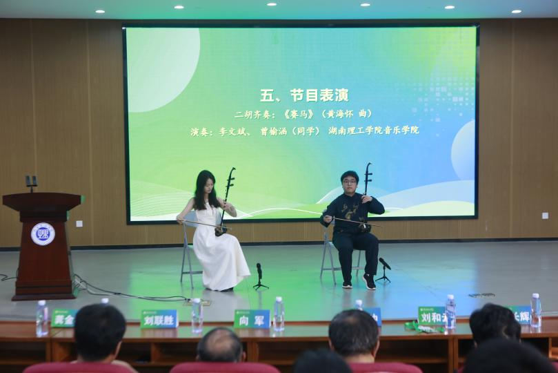 闭幕式由学校教务处处长彭鑫教授主持,华中科技大学陈刚教授对参赛作品进行了详细点评,并向各团队分享了自己多年来参与节能减排竞赛的宝贵经验。音乐学院带来《美丽的心情》女声独唱、《赛马》二胡齐奏的精彩表演。随后,进行了庄严的会旗交接仪式,第三届承办单位国防科技大学代表赵玉新教授进行了表态发言。最后,副校长刘长辉教授宣布第二届湖南省大学生节能减排社会实践与科技竞赛顺利闭幕。