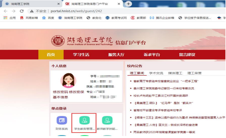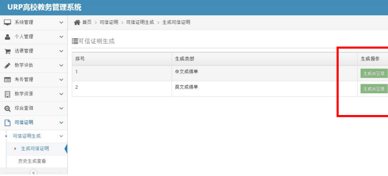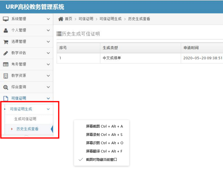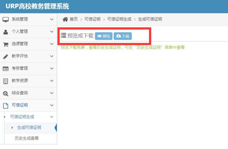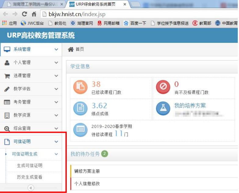 学生申请可信证明的操作流程 1 )通过 https://www.hnist.cn/ 湖南理工学院官网进入信息门户(右上角)。 2 )输入学号和密码登录。 3 )点击【学生教务管理系统】。 4 )点击【可信证明】→【可信证明生成】→【生成可信证明】 5 )在【生成可信证明】页面按需求选择证明类型,然后点击【生成并签章】。 6 )可信证明生成后,可选择【预览】进行浏览或点击【下载】保存。 7 )学生通过【历史生成查看】可看到自己所有的可信证明生成记录。