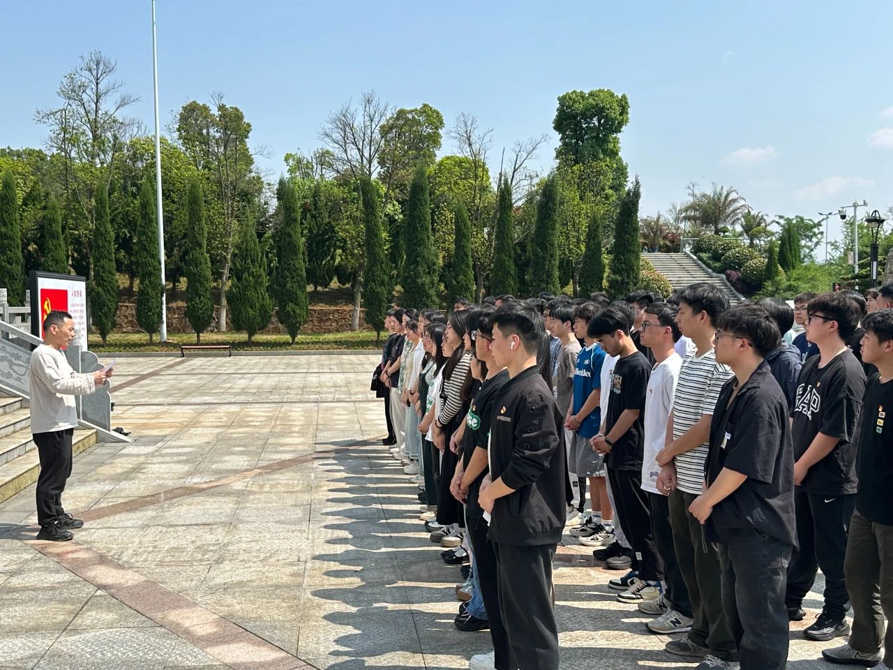 此后,吁锤老师在革命先烈纪念碑下为大家讲了一堂党课。他慷慨激昂地讲述了彭遨烈士的英勇事迹,希望学生党员学习革命先烈身上那顽强拼搏、不畏艰险、勇往直前、艰苦奋斗的革命精神,坚守正确的人生道路,练就过硬本领,发扬红色传统,传承红色基因,做一名有理想、敢担当、能吃苦、肯奋斗的新时代红色青年。他强调,青年党员不仅要倾听革命英雄的故事,更是要讲好英雄故事,学习英烈精神,接受深刻的革命传统教育,激发对党的热爱和忠诚,不忘初心,牢记使命。