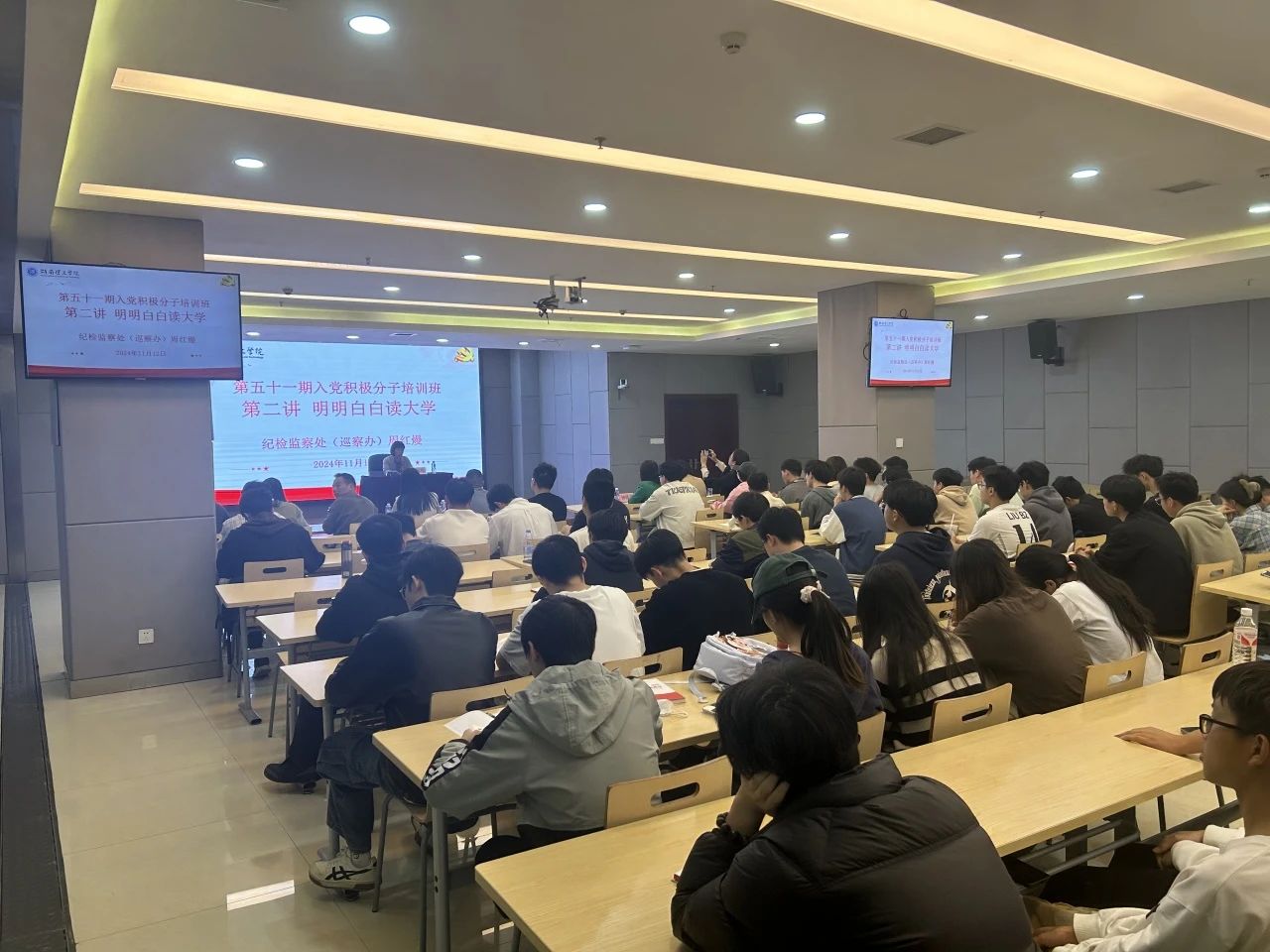 11月12日下午,我院在图书馆多功能厅举办第五十一期入党积极分子培训班第三课。本次党课主题为“明明白白读大学”,由纪检监察处(巡察办)处长周红熳主讲,51fun吃瓜入口第51期入党积极分子培训班学员参加。
