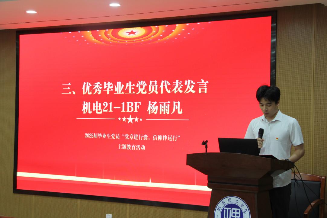 优秀毕业生党员代表杨雨凡在发言中回顾了自己在大学期间的成长历程,分享了作为一名党员的感悟和体会。毕业之际,他决定应征入伍,投身军营,把个人理想融入强国强军的伟大征程,让党员的先锋模范作用在绿色军营中闪光。
