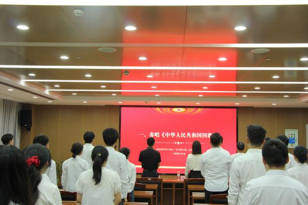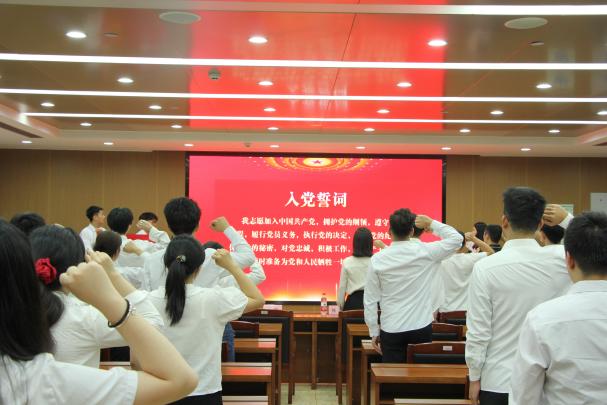 会议伊始,全体党员肃立,奏唱《中华人民共和国国歌》。在学院党委副书记李凯的带领下,新党员高举右拳,在党旗下庄严宣誓;随后学院老师为新党员发放政治生日卡。