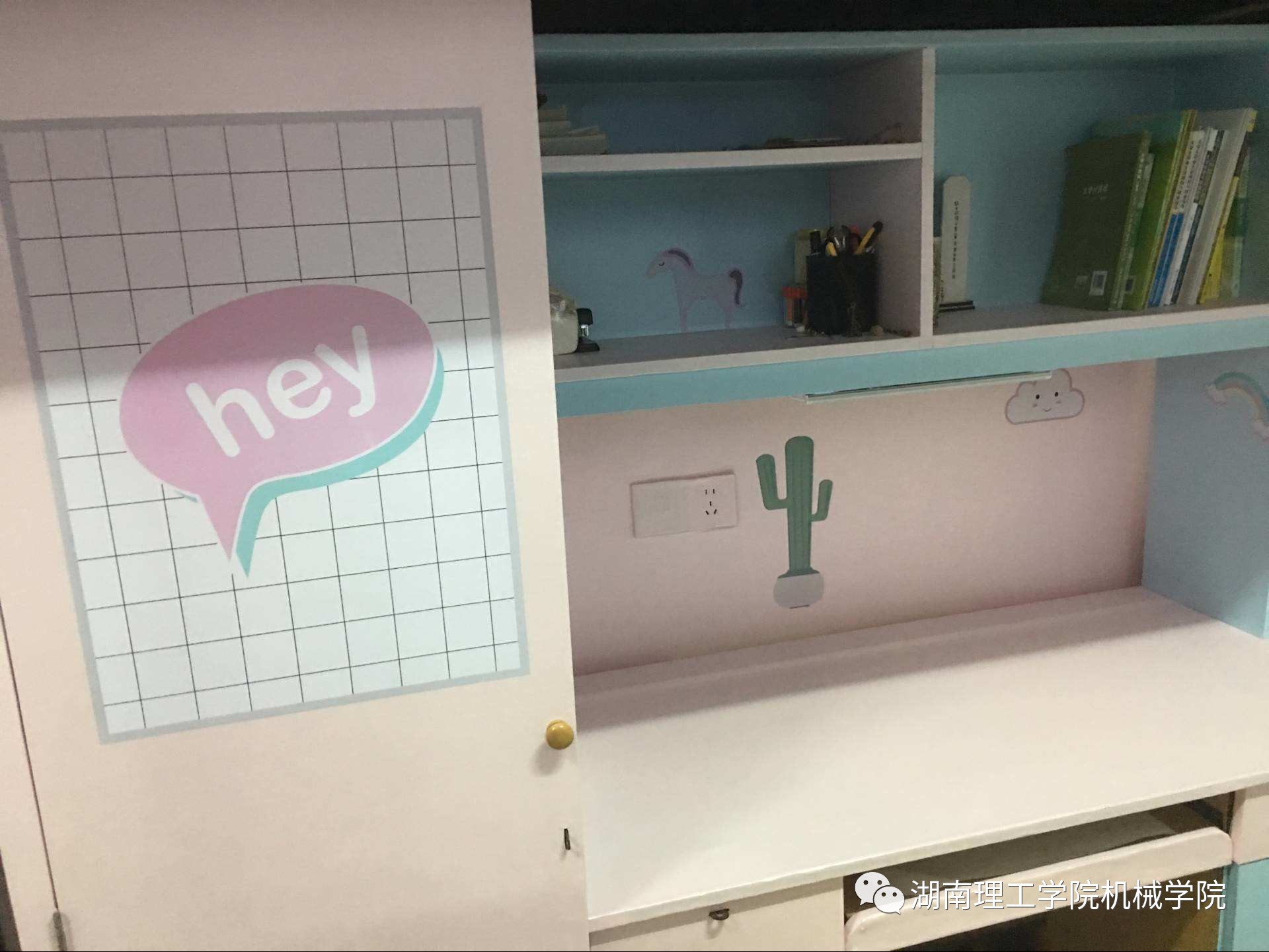 8# 423是不是让你觉得眼前一亮?粉嫩的颜色,可爱的图案,居然连插座也进行了点缀,细节装饰甚至让女生都自愧不如。还有由一块块的字母拼成的小地毯,带着童真的感觉,只要有心,谁都能让自己的寝室展现出不一样的风采。(通讯员/李英)